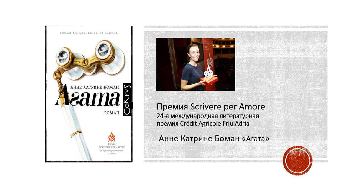 Роман датской писательницы Анне Катрине Боман «Агата» я прочла в рамках марафона «Читаем книги Набокова, Рушди, Диккера и других премиальных авторов». Роман был удостоен премии Scrivere per Amore (в переводе с итальянского - Премия «Писать ради любви») как лучшее произведение о любви и переведен почти на тридцать языков. Анне Катрине Боман живет в Копенгагене, где она занимается писательской деятельностью и работает психологом. Роман «Агата» ее дебютный роман, так же у нее есть выпущенные сборники стихов. Роман был написан в 2017 году, на русском языке впервые издан в 2021 г