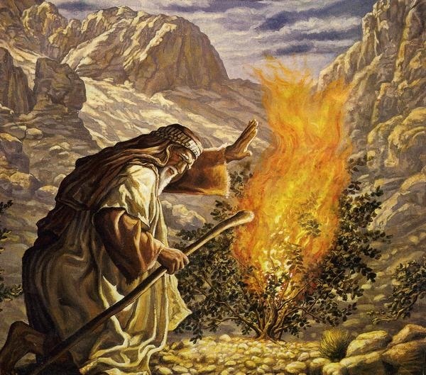 «И явился ему ангел Господень в пламени огня из среды тернового куста. И увидел он, что терновый куст горит огнём, но куст не сгорает. Моисей сказал: "Пойду и посмотрю на это великое явление, отчего куст не сгорает". Господь увидел, что он идёт смотреть, и воззвал к нему Бог из среды куста, и сказал: "Моисей! Моисей!" Он сказал: "Вот я!" И сказал Бог: "Не подходи сюда; сними обувь твою с ног твоих, ибо место, на котором ты стоишь, — земля святая". И сказал ему: "Я Бог отца твоего, Бог Авраама, Бог Исаака и Бог Иакова". Моисей закрыл лицо своё, потому что боялся воззреть на Бога» (Исх. 3:2–6).