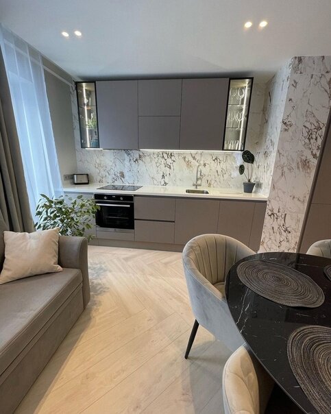 Обошлась нам она в 350 тыс. рублей. Фасады Алвик, а столешка из акрилового камня.