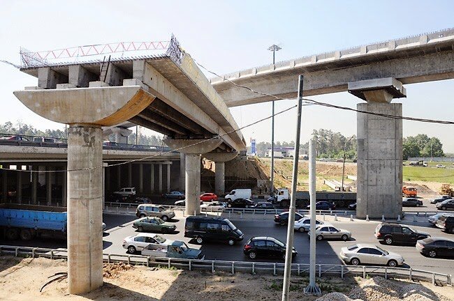 Возведение эстакады целесообразно при пересечении автодорогой большого количества железнодорожных путей, городских улиц или небольших рек.