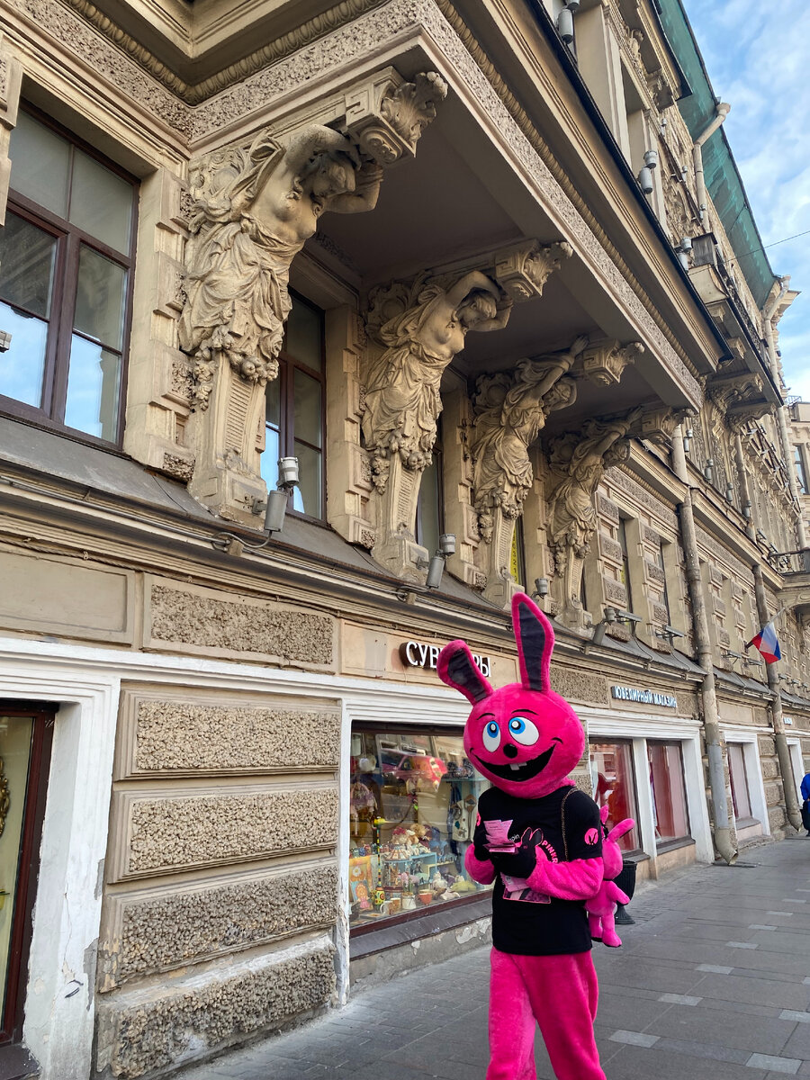 Сначала проходим по нечетной стороне Невского проспекта до Пушкинской улицы. По дороге мне попадается розовый кролик. как же он тут неуместен!