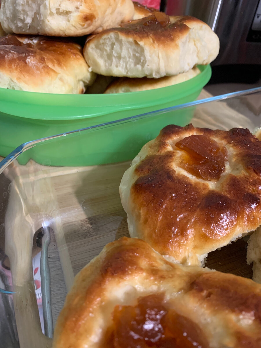 С похолоданием у меня появляются ассоциации совместного семейного питья чая да молока с сдобой. Постоянно выпечки становится зимою больше и чаще. Но темп жизни диктует выискивать рецепты на которые не уходит масса времени. Сразу предупрежу. Рецепт простейший, но количество продуктов задействовано на большую семью. Необходимые продукты: * Молоко ( комнатной температуры-я взяла из холодильника и подогрела в микроволновке)-800 мл; * 200 гр сахара ( я уменьшила, мне показалось сильно сладко будет, ни в коем разе не делайте так, тесто на выходе вышло менее сладким); * 2 яйца; * 150 мл растительного масла; * 1 ст.ложка сухих дрожжей ( я пекла на сырых, по рекомендации с упаковки. Пекла на таких первый раз и мне понравилось, на сухих тоже попробую); *Муки 1400 гр (мне кажется у меня вышло больше, потому что тесто продолжало прилипить к рукам, добавляла по чуть чуть, очень боялась утяжелить и "забить" мукой тесто.) *Джем на ваш вкус, у меня был абрикос. В перечисленной очерёдности смеши
