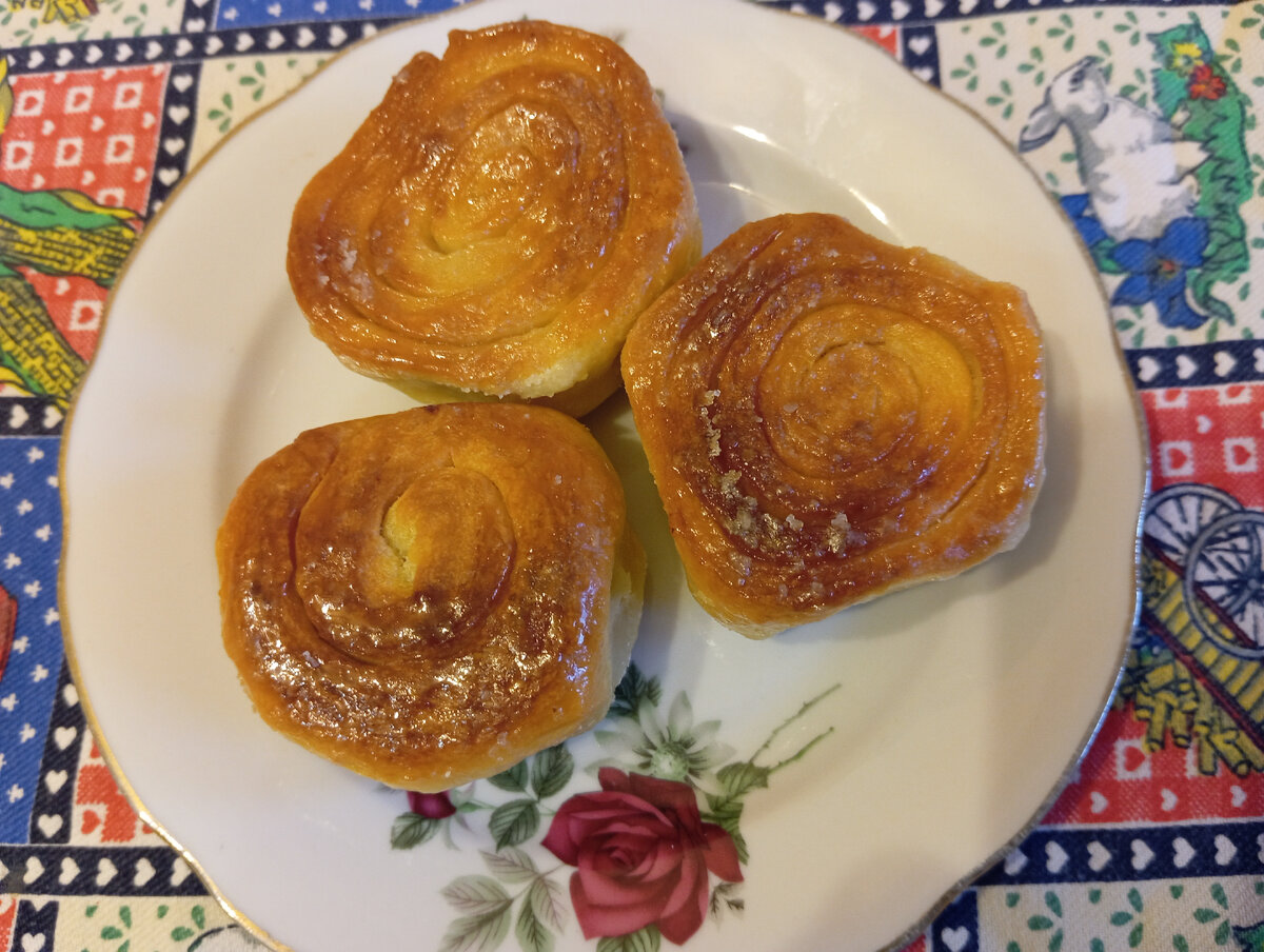 Состав продуктов: -Творог нежирный 250 грамм -Мука пшеничная высшего сорта 250 грамм плюс мука для раскатки теста - Масло сливочное 50 грамм -Сахар-песок 80 грамм -Яйцо сырое 1-2 штуки (в зависимости от размера) -Ванильный сахар -Соль на кончике ножа Творог протираю через сито и перемешиваю с мукой. Размягченное сливочное масло добавляю к творожно-мучной смеси. Небольшое количество масла оставляю для смазывания . Яйца с солью взбиваю миксером в пену, постепенно добавляя половину порции сахара. Выливаю взбитые яйца в творожное тесто и тщательно вымешиваю. Тесто получается эластичное, к рукам не липнет. Скатываю тесто в шар, немного смазываю маслом и оставляю по пленкой и или полотенцем отдохнуть пару часов. Раскатываю тесто в прямоугольник, равномерно смазываю оставшимся маслом и посыпаю сахаром. Скатываю тесто в рулет и разрезаю его на кружочки толщиной примерно 1 см. Укладываю булочки на смазанный маслом противень и выпекаю при температуре 180-200 градусов около часа