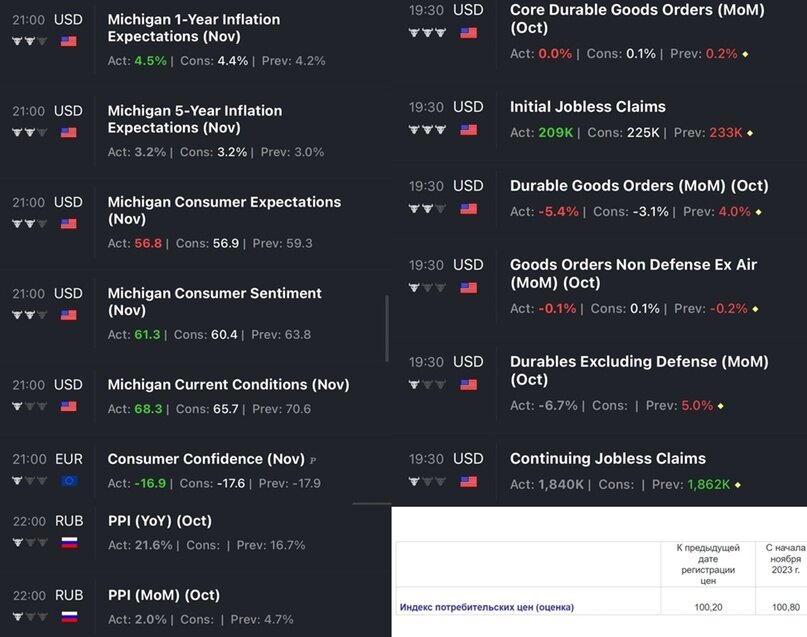 Новая порция статистики по США – новое разочарование. Несмотря на победные заявления руководства США о победе над инфляцией население отказывается в это верить. Исследования Мичиганского института (главный в мире по исследованиям потребителя) показали рост инфляционных ожиданий населения до 4,5% через 1 год и до 3,2% через 5 лет. ФРС считала, что что инфляционные ожидания «заякорены», теперь придется пересмотреть позицию и работать как Банку России. Будет ли американцы применять свои же рекомендации по уверенному росту ставки в условиях роста ценовых ожиданий населения - посмотрим. В новейшей истории такого в США не было. В целом потребитель в США и ЕС чувствует себя неуверенно, немного лучше, чем в пик кризиса 2022 года. Позитив не прослеживается. В США сокращаются заказы на производство товаров длительного пользования, но статистика дается помесячно и показатель очень шумный, поэтому нужно хотя бы 3 месяца последовательного снижения – пока такого не видно. Снижаются заявки на пособие