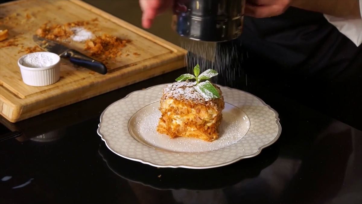 Рецепт Ингредиенты Приготовление 2.Раскатайте каждый пласт теста небольшими квадратиками. 3.Переложите пластики теста на противень и выпекайте 12-15 минут при 80 градусах. 4.Для заварного крема: отделите желтки от белков и выложите их в глубокую сковороду. 5.Влейте 500 мл молока, добавьте сахар, кукурузный крахмал и ванилин. Тщательно перемешайте. 6.Поставьте сковороду на средний огонь и заварите крем, постоянно помешивая. 7.Когда крем загустеет, снимите его с плиты и продолжайте помешивать, пока он горячий. 8.Положите крем в глубокий противень, распределите равномерно и накройте пленкой. 9.Уберите в холодильник до полного остывания. 10.Измельчите три выпеченных коржа руками - это будет посыпка. 11.Разделите оставшиеся коржи пополам. 12.Добавьте немного молока в крем и перемешайте. 13.На нижнюю часть коржа выложите крем, затем следующую часть коржа, слегка придавая изгибы. Повторите с оставшимися коржами. 14.Обмажьте верх и края пирога кремом и посыпьте крошкой. 15.Украсьте п