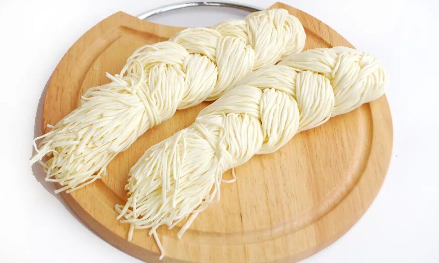 После этого приступают к разминанию и растягиванию сырного теста. Вытянутую сырную ленту нарезают, завязывают в узелки или подают в специальные формы, после этого охлаждают. Для фигурных сыров используют нити диаметром до 16 мм. Их заплетают в косички или придают другие формы.