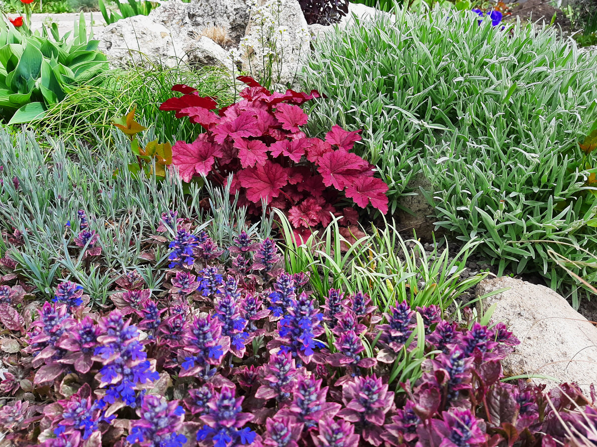 Рядом со старым, большим цветником расположена моя альпийская горка, сложилась она вынуждено, в этом месте была яма, а после земляных работ при строительстве дома было выкопано много камней известняка. Вообще наши дачи расположены на скальных породах, когда недалеко от нашего дома прокладывали объездную трассу, там приходилось проводить взрывные работы. Нашим КавМинВодским горам лакколитам около 10 миллионов лет, их в округе 17 штук, как я уже писала ранее к нашей даче ближе всего расположена гора Машук. Ну так вот, горка собрана из «родных» камней, выкопанных на моём участке, я бы и ещё их насобирала (лежат никому не нужные в округе), но физически это тяжело выполнимая миссия. Но я не сдамся, поднимать горку нужно, поймаю у мужа благодушное настроение и упрошу притащить ещё несколько штучек. Так вышло, что на моей горке, вопреки бытующему списку, рекомендованных «альпийских» засухоустойчивых растений, живут и здравствуют хоста, гейhера и сибирский ирис. Этот голубой ирис у меня был
