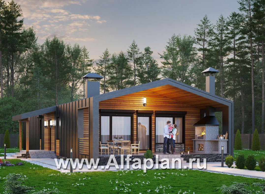 ✅Фасад этого современного одноэтажного дома будет незабываемым благодаря своей отделке и деталям. Фальцевая кровля прекрасно дополняет общий вид, а деревянная отделка на стенах террасы создает атмосферу уюта и тепла. ️