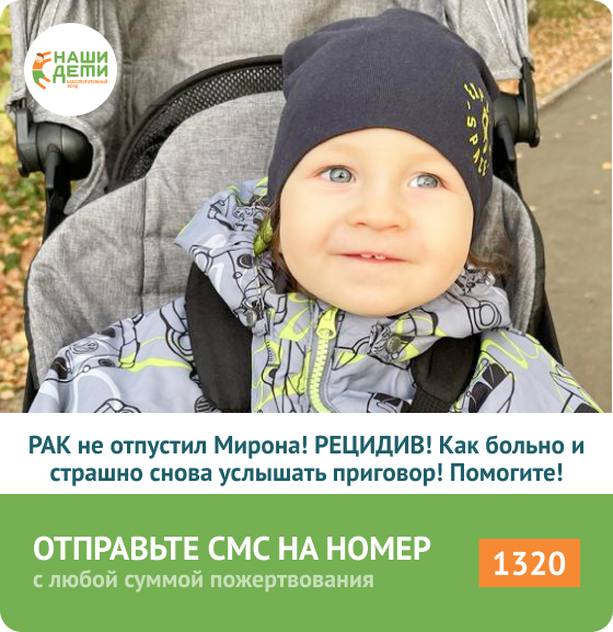 РАК не отпускает Мирона. Благодаря Вашей финансовой поддержке удалось провести очередное обследование и обнаружить очаг РАКа. Впереди новая борьба за жизнь. Без Вас Мирошку не спасти! ПОМОГИТЕ МИРОНУ СЕЙЧАС >>> Здравствуйте, дорогие наши друзья и помощники! В этот раз нашему Мирошке не повезло: на краю кальцината (погибшей ткани опухоли) появились активные раковые клетки. Врачи приняли экстренные меры, очаги купировали лазером. От проверки зрения в клинике пришлось отказаться. Мироша сильно плакал, и провести это сложное обследование правильно не получилось бы. После осмотра и лечения глаз Мирон около получаса находился в реанимации, просыпаясь после наркоза, из которого в этот вышел хорошо. Всё это стало убедительным примером того, как своевременная помощь становится спасением жизни! В этот раз терапия стала возможной только благодаря Вашей доброй помощи! Сейчас Мироша с мамой дома. Семья уже занимается оформлением виз и подготовкой к следующей жизненно важной поездке. Очередной осмот