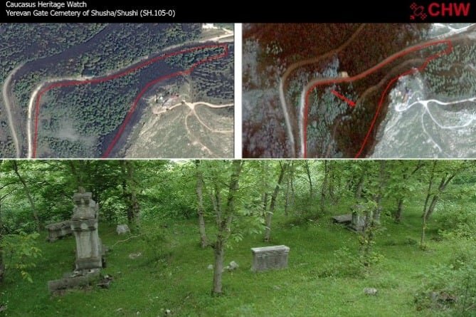 В период с 5 октября по 3 ноября с использованием бульдозеров была проложена дорога через историческое кладбище в Шуши, известное как кладбище у Ереванских ворот", - заявляет международная организация по защите кавказского наследия Caucasus Heritage Watch. Отмечается, что между деревьями расположено как минимум 78 надгробий с армянскими надписями, датированные периодом с 1802 по 1913 годы. Организация опубликовала в соцсетях спутниковые фотографии, отмечая, что неясно, сколько надгробий было повреждено, но как показывают исследования, захоронения покрывали всю территорию. "Это пятое армянское кладбище, подвергшееся воздействию (Азербайджана - ред.) с ноября 2020 года, после разрушения Мец Тагера и Сгнаха, а также повреждения кладбищ в Нижнем Шуши и возле Вазгенашена", - указывает CHW.