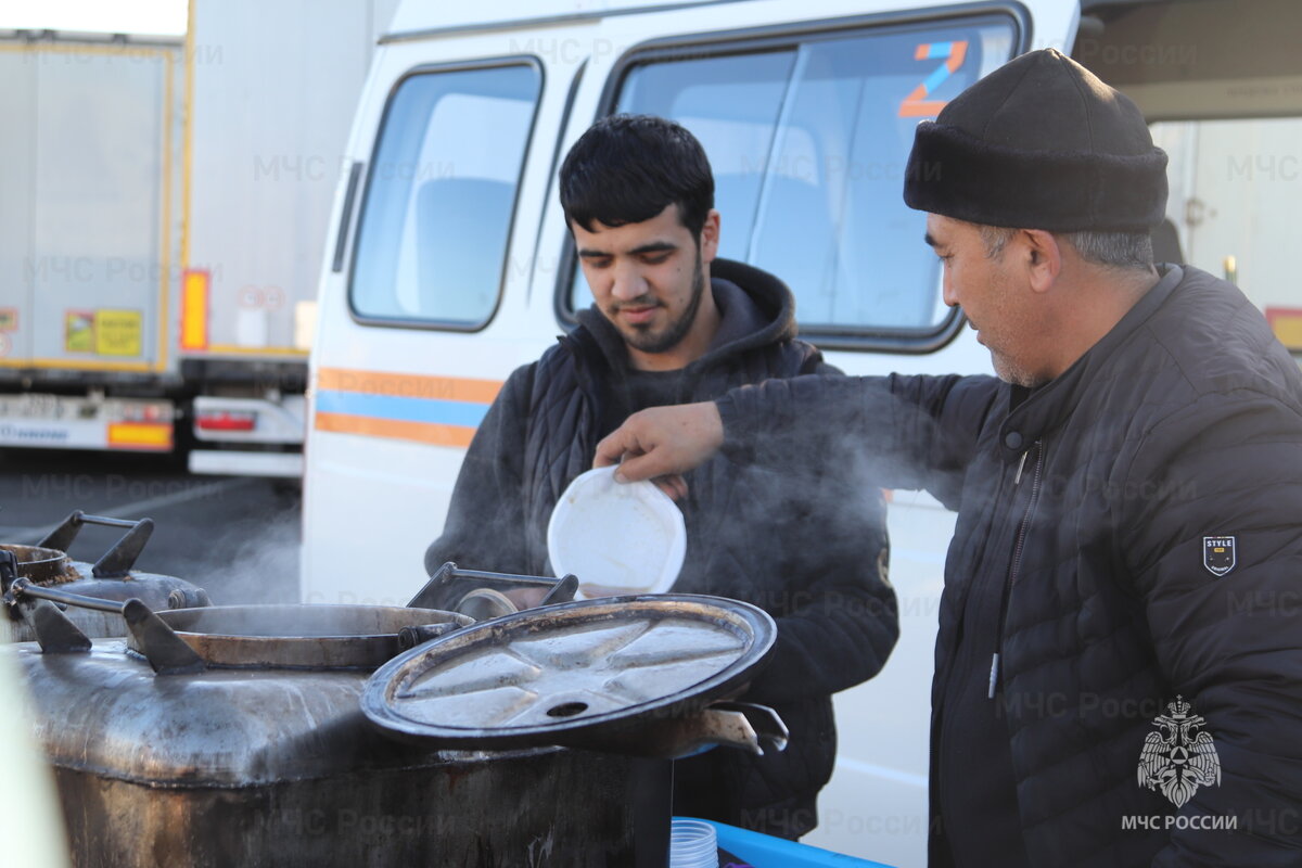 Это не первая совместная акция: сотрудники МЧС России, и АМС г. Владикавказа стараются регулярно поддерживать водителей и пассажиров, которые вынуждены иногда долгое время ожидать проезд через границу. В данный раз горячее питание привезли водителям, ожидающих возобновления проезда на одной из самых крупных стоянок вблизи Владикавказа, рассчитанной на 1000 большегрузов.