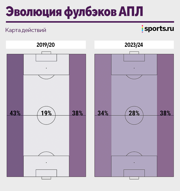 На картинке – распределение действий фланговых оборонительных игроков АПЛ по трем каналам: левому, центральному и правому. Вы и сами заметили, теперь фулбэков гораздо чаще можно встретить в центре. Примечательно, что идея Пепа распространилась преимущественно на левых защитников, тогда как позиции правых на фланге оказались более стойкими. Тем не менее этот тренд доберется и до них.