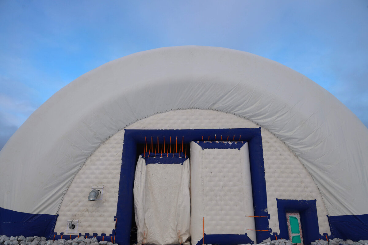 На «Олконе» для прохождения технического осмотра и проведения ремонтных работ устанавливают надувной ангар. Необычный объект разворачивается на Печегубском карьере.