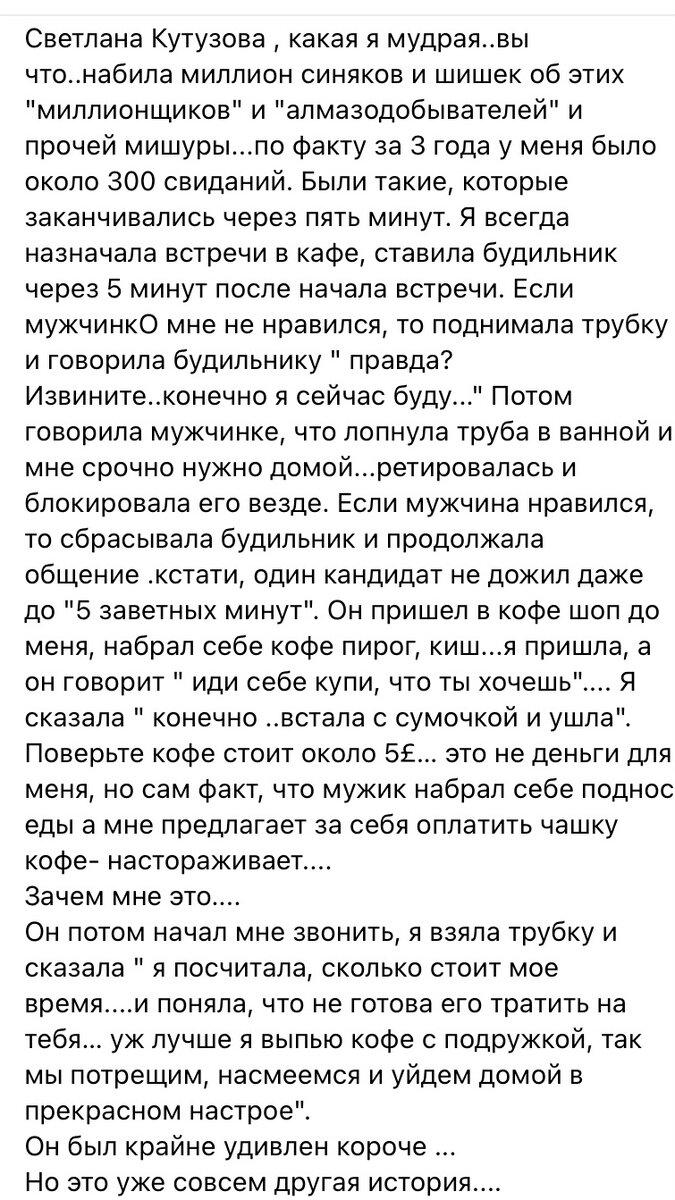 И отдельно обращусь к тем, кто «самый умный» и пишет в презрительной форме о том, что я полтора года бессмысленно хожу на свидания и такая я наивная, что не могу до сих пор сделать вывод, что перспектив тут примерно НОЛЬ.