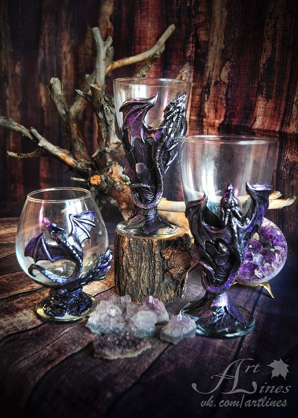 Не совсем мастер-класс, скорее небольшой фотоотчет с техническими комментариями. Декорирование бокалов полимерными драконами. Несколько готовых фото и процесс. "Аметистовые драконы" - крупные бокалы с декором из полимерной глины, тонированной металлическими пудрами 12 разных оттенков. Декор дополнен небольшим количеством натуральных кристаллов аметиста. 1 этап - берем полимерную глину и инструменты. Мы пользуемся premo. Для обработки - резец + резцы для дерева или бересты (с закругленными лезвиями), стек, зубочистка, металлическая игла со слегка загнутым кончиком. Для раскатывания полимерной глины мы пользуемся пастомшинкой, но вполне подойдет обычная кухонная скалка или стеклянная бутылка. Делаем заготовки для дракона: "пиявка" для тела и нечто под голову и будущие крылья. 2 этап "Пиявка" и другие заготовки тщательно обрабатываются с помощью набора незатейливых инструментов, представленных на фото. Получается вот такой "суповой набор" дракона. 3 этап Мы делаем драконов в сочетании с л