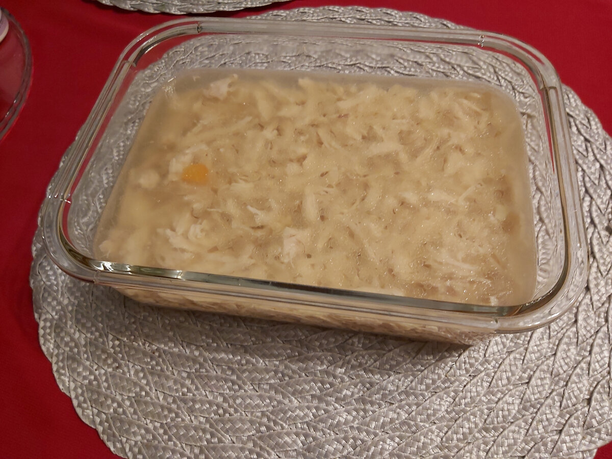 Ну сегодня я опять без граммовок. Берем целую курицу, отвариваем ее с добавлением специй, я добавляю обычно только лук, чеснок, соль и перец. Отварную курицу разбираем на волокна. Берем быстрорастворимый желатин и разводим его в 1-1,5 л куриного бульона, это смотря на то, кому сколько надо желешки сверху)) Я люблю чтобы было только мясо). Желатин разводим по инструкции на упаковке ( обычно 30-40г на 1 литр жидкости. Выкладываем в формы мясо, заливаем разведенным желатином и отправляем в холодильник. Я убираю на ночь.