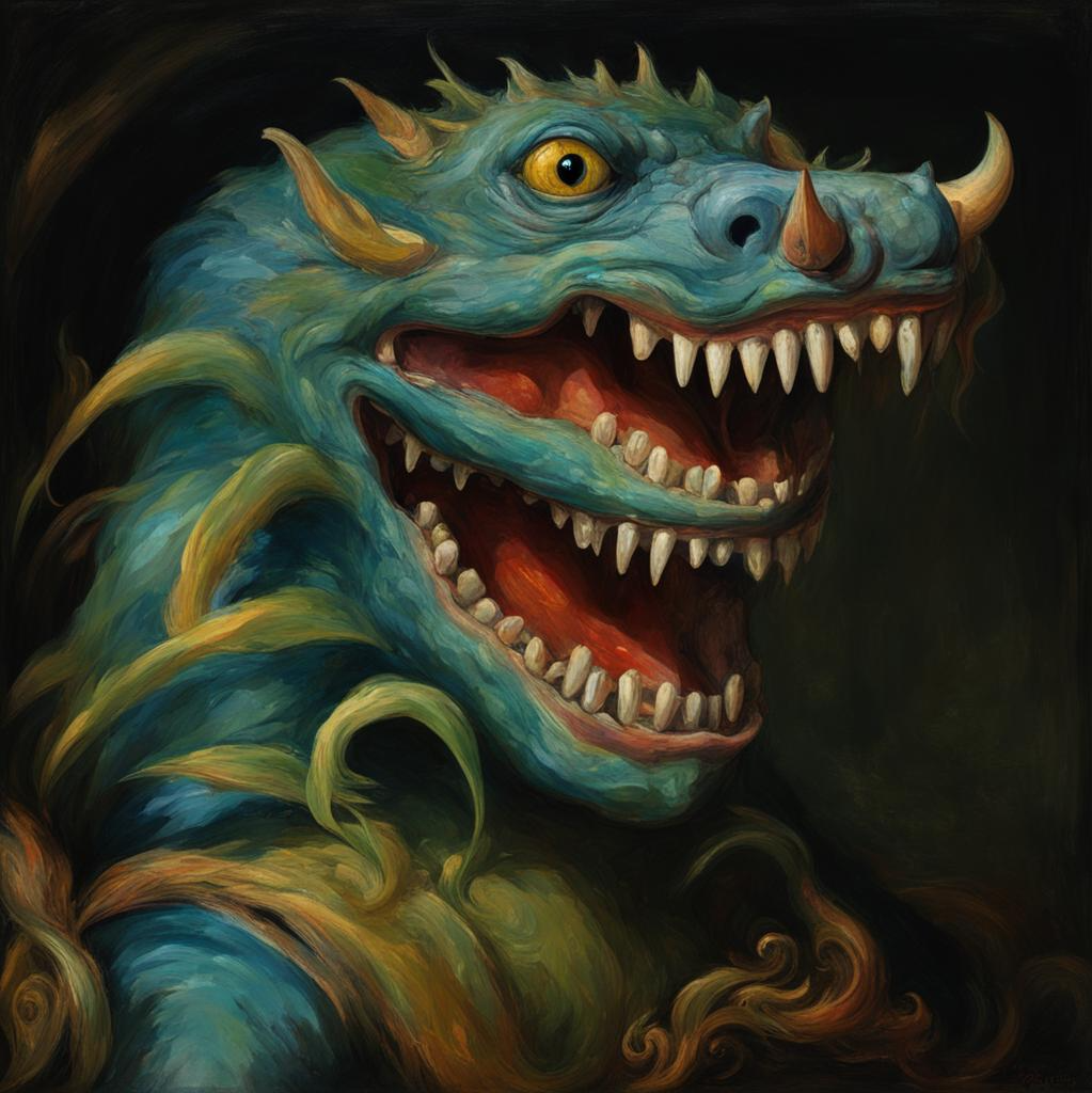 Английский стих про микроба в моём переводе такой: МИКРОБ Микроб настолько мал, друзья, Что рассмотреть его нельзя, Но утверждают, что Микроб Изучен будет в микроскоп. Ряды кривых его зубов И пять ветвистых языков, И пучковатые хвосты В разводах дивной красоты, И чудный крапчатый узор, В котором всех цветов набор, Бровей зелёных, синих век, Ещё не видел человек... Как знать, сумеет или нет Он разглядеть такой портрет? Что до меня, то поручусь: К тому я вовсе не стремлюсь!!! Это первый вариант создания портрета такого микроба по описанию. Что ж, слегка соответствует! Второй вариант вопреки надеждам не столь удачный. Хотя идея о выпученных глазах рядом с обычными глазами рептилии нравится. Вот это уже веселей! Этот вариант сочетает достоинства всех предыдущих. Ну что же и это неплохо! Может быть попросим восемь глаз? Система не послушалась. Добавим слово "многоглазое" Вот этот "товарищ" уже достаточно нелепый, чтобы соответствовать шуточно-ужасному описанию стихотворения. Я бы его у