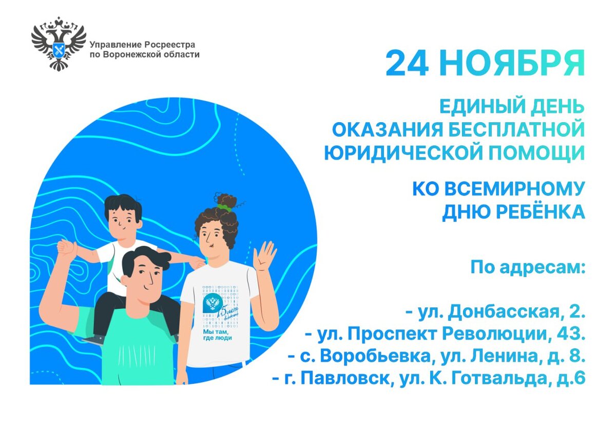 В пятницу 24 ноября, в рамках проведения Единого дня оказания бесплатной юридической помощи, проводимого Ассоциацией юристов России, приуроченного к Всемирному дню ребёнка, в Управлении Росреестра по Воронежской области, состоится приём граждан.
