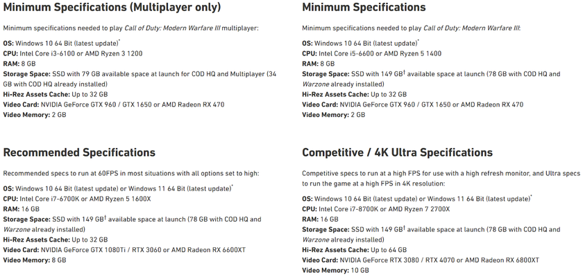 На официальном сайте Call of Duty: Modern Warfare 3 (2023) приведены сразу 4 спецификации. Мы изучили независимые тесты игры на разном «железе» в разных разрешениях и пришли к выводу, что официальные системные требования примерно соответствуют истине.