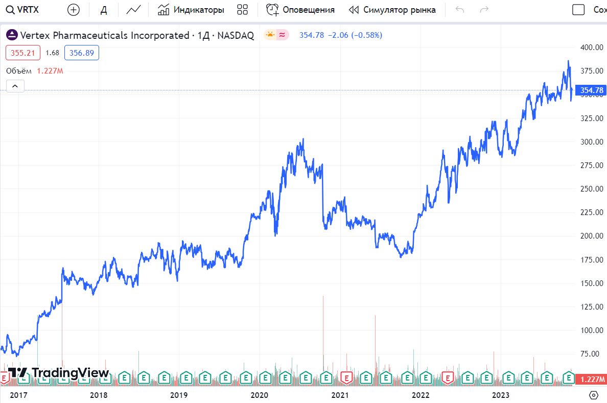 - рост цены акции в 1,5 раза с начала 2022 года Сегодня мы говорим про Vertex Pharmaceuticals Компания Vertex Pharmaceuticals (VRTX) находится в авангарде новаторских методов лечения больных муковисцидозом (МВ), а ее четыре одобренных препарата являются единственными средствами, направленными на устранение основной причины этого заболевания. Примечательно, что Vertex занимает около 70% рынка препаратов для лечения МВ, что свидетельствует о ее доминирующем положении в этом терапевтическом пространстве. Успехи компании в области МВ занимают уникальное положение на рынке препаратов для лечения редких заболеваний, который оценивается примерно в $200 млрд. Перспективы Стремление компании к инновациям выходит за рамки МВ и включает в себя многообещающую линейку потенциаль