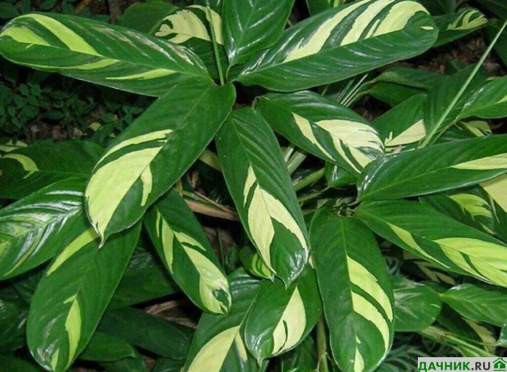 - Это декоративная многолетняя культура, вырастающая в естественной среде до 2.5 м. В комнатных условиях эти показатели более скромные – не больше 1 м. Листовые пластины крупные с тёмно-зелёной гладкой поверхностью. В зависимости от разновидности они украшены желтоватыми, бледно-зелёными или серебристыми полосочками, лучики же исходят из центральной части листьев к их краюшкам.