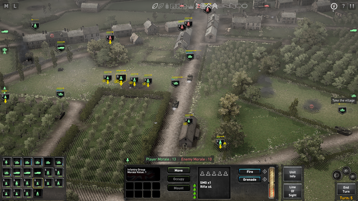 Все войска в игре делятся на пехоту и бронетехнику. Отряды пехоты состоят из двух-пяти человек, а техника – это всегда одна единица. У всех юнитов есть два общих приказа: движение и стрельба. Пехота может пройти где угодно, способна перепрыгивать через заборы и бокажи и занимать здания, а бронетехника сниженную по сравнению с пехотой проходимость и необходимость тратить очки движения на разворот компенсирует скоростью, особенно при движении по дорогам. Со стрельбой интересней: кроме стрельбы многим видам пехоты доступно метание гранат для борьбы с техникой и выкуриванием пехоты из зданий, а танкам сначала нужно повернуть башню и взять врага на прицел. На меткость влияет расстояние, наличие прямой видимости, двигался ли стреляющий юнит и не подавлен ли он вражеской стрельбой (это наглядно демонстрирует шкала стабильности), а так же, сколько ходов длилось прицеливание при условии, что враг оставался на месте. Если шанс на попадание достигает ста процентов, то при стрельбе по танкам позволяют сделать прицельный выстрел по гусеницам, орудию или корпусу.