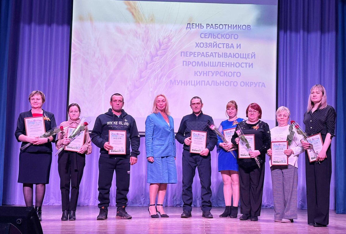 В Кунгуре прошла церемония награждения работников сельского хозяйства и перерабатывающей промышленности. В зале Кунгурского колледжа агротехнологий и управления отметили профессиональный праздник, на котором собрались лучшие работники отрасли, чей вклад в общее развитие сельского хозяйства в Кунгурском округе был заслуженно отмечен наградами. Земли округа щедры на урожай, но без людей на них трудящихся не было бы того богатства, которое мы имеем. Им и был посвящён этот праздник. В хозяйствах округа трудятся порядка двух тысяч человек. Благодаря золотым рукам аграриев наш округ сохраняет лидирующие позиции в Пермском крае по производству молока и яйца, по намолоту зерна. Ежегодно наращивается стадо крупнорогатого скота. От года к году увеличивается поголовье молочного стада. Значительно увеличивают объёмы мясоперерабатывающие производства. - Это заслуга уважаемых руководителей, уважаемых работников сельского хозяйства. Благодаря вам обрабатываются поля и производится продукция не только