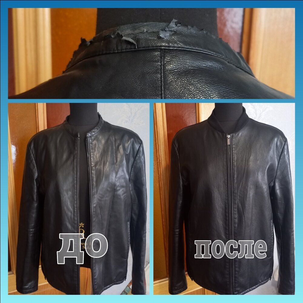 Сотрудница принесла мне куртку из кожезаменителя в хорошем состоянии, на которой в области горловины кожа начала лупиться, сказав при этом, что приготовила ее на выброс, но решила спросить можно ли что- нибудь с ней сделать. Поскольку подобрать кожу такого же оттенка и качества проблематично, решено было сделать воротничок из трикотажного полотна в резинку как у бомбера. Сначала я выпорола старый облупившийся воротник. Затем приготовила полоску из трикотажного полотна шириной 9 см в готовом виде 4,5 см, поскольку кусочки трикотажа были не большие пришлось стачать две полоски и сделать шов посередине. Припуски разутюжила едва прикасаясь утюгом. Далее сложила стачаную полоску пополам и слегка приутюжила. Приложила к горловине, чтобы определиться с размером полосы. Концы полосы закруглила. Приметала к лицевой стороне куртки так ,что бы шов стачивания полоски совпал со швом посередине спинки. Пристрочила на швейной машине. Затем распорола частично внутренний шов в подкладке рукава и выверн