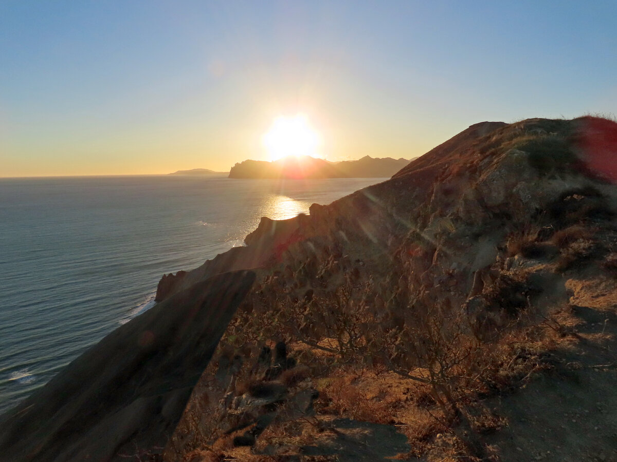 Начало: Часть 1. Окрестности Коктебеля. Часть 2. Разноцветные виноградники. Часть 3. Хребты и долина. Часть 4. Тихая бухта. Часть 5. Под крутыми склонами. Часть 6. Скумпия. Часть 7. Привал на 5-м мысе. Часть 8. На хребте. Тем временем солнце все больше склонялось к горам. Тень от Святой перекрывала солнечную дорожку. И само солнце не хотело, что бы у меня получились фотографии и не жалея, разбрасывало в объективе огромные красные и зеленые круги. По этой же причине не будет и видео. А мы шли все дальше по хребту . Орджоникидзе и склоны ярко сияли в лучах закатного солнца. Тепе-Оба тоже красовалась своими мягкими тенями. Да. Закат на горе ждать уже незачем. Он закончился, так и не успев начаться. Ну что же ! Солнце есть, а дорожки нет. Бывает и так! Оглянулись на немного окрашенные дальние горы за Коктебелем, и ушли вниз. Пока спустились, наступили уже сумерки. Но я не грущу, что закат не получился таким ярким, как хотелось бы. Ведь сегодня и так было столько много неожиданной осе
