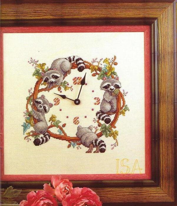Очаровательные вышитые часы с енотами и белочками. Схема вышивки.