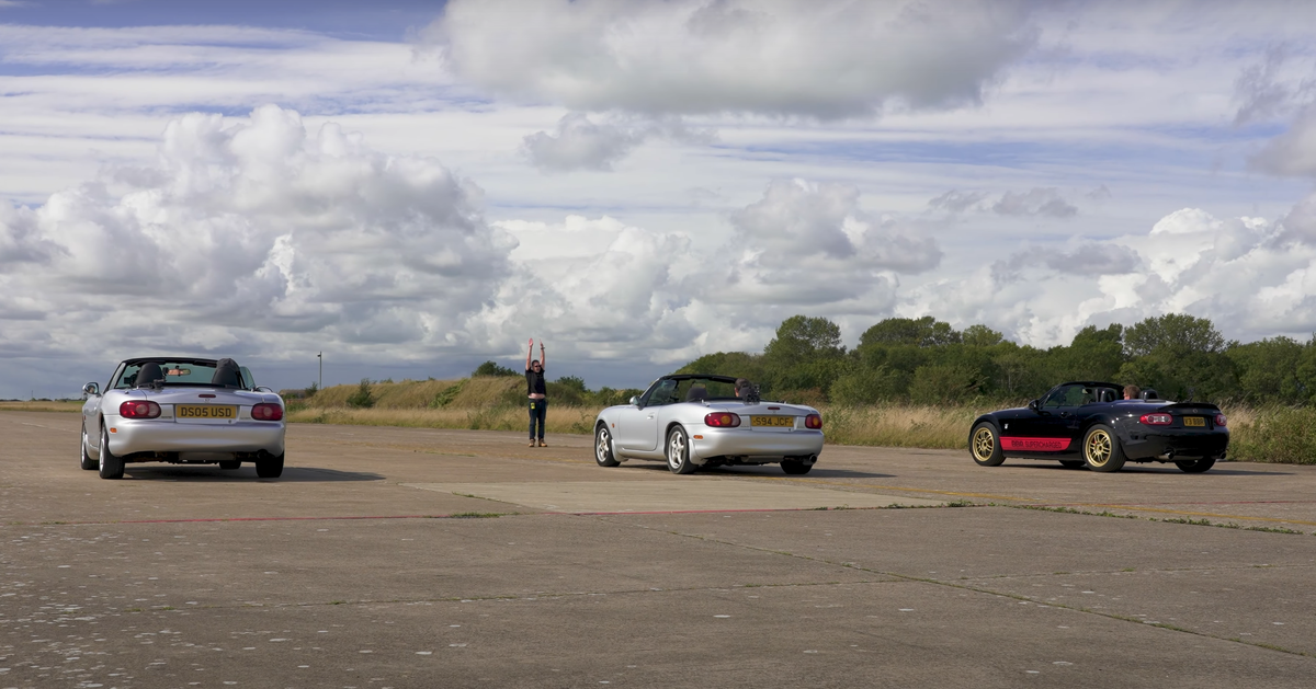 Блогеры с популярного канала Carwow устроили очередную гонку по прямой, в которой вновь встретились три культовых родстера Mazda — автор YouTube-канала Мэт Уотсон выставил в заезде собственную Mazda MX-5, она же Miata, второго поколения NB. Автомобиль оснащен компрессорным двигателем, а соперниками для него стали аналогичная стандартная модель безо всяких доработок и третье поколение Mazda MX-5 NC в тюнинговом варианте с 248-сильным мотором. Mazda Miata второго поколения NB оснащается 1,8-литровым четырёхцилиндровым двигателем мощностью 146 лошадиных сил и крутящим моментом 168 Нм, весит родстер уже более тонны — 1065 килограммов. Доработанный родстер блогера имеет ряд доработок, включая компрессор, что позволило получить отдачу уже 190 лошадиных сил. Третье поколение Mazda Miata в кузове NC оснащено 2,0-литровым 4-цилиндровым двигателем мощностью 160 сил и 188 Нм с 6-ступенчатой механической коробкой передач, а при массе 1100 килограммов — это самый тяжёлый автомобиль в заезде. Однако
