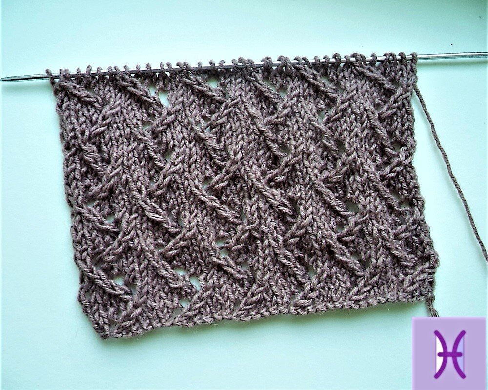 Описание вязания узора. Раппорт равен 6 петлям по ширине и 8 рядам по высоте вязания. Количество петель в наборе должно быть кратно 6 плюс 2 кромочные петли.