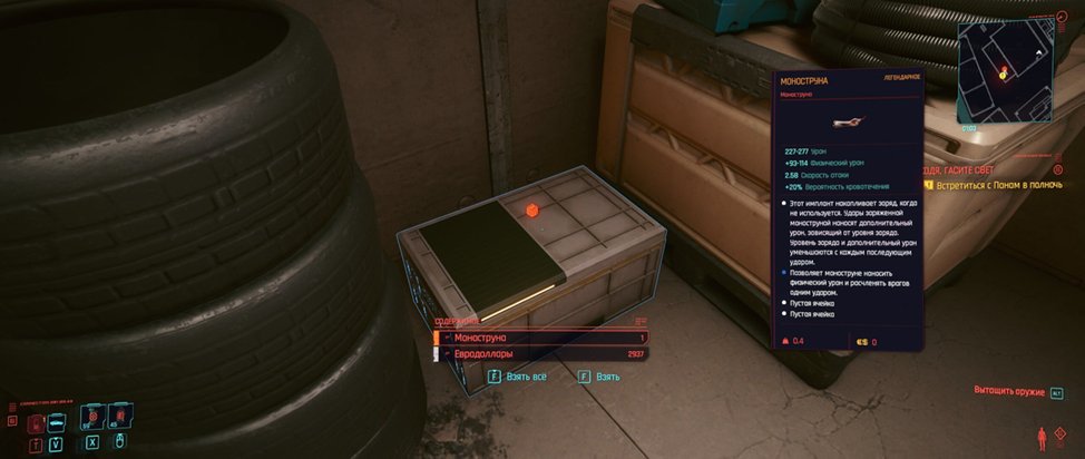Легендарная Моноструна Этот имплантат у рипперов стоит дорого, поэтому вам следует сэкономить. Более того, спрятанная в городе моноструна-легендарный и более мощный, чем купленный у риппера. Единственная проблема - найти его. Местонахождение - район Кабуки. Ориентир - аптека. Вы приходите на это место и обнаруживаете единственный гараж с открытой дверью. Охранников нет. Только зайдите внутрь и заберите предмет и евродоллары. Катана «Сатори» Еще одно оружие, доступное во время прохождения миссии, но эту катану большинство игроков пропускает. Это и неудивительно, ведь во время выполнения задания "Путь в высшую лигу" они насторожены и у них нет времени осматриваться. Вы, наверное, заметили, что в помещении тюрьмы Арасаки есть лестница на второй этаж. В начале миссии там ничего нет, и возвращаться туда потом кажется бессмысленным. Но когда становится жарко, и башня Арасаки оказывается опечатанной, вместо побега возвращайтесь на второй этаж и поднимитесь на крышу. Там вас ждет вертолет с дв