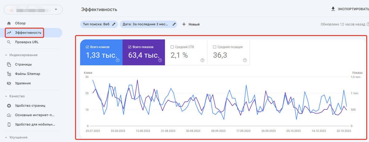 Продолжим изучение блоков в Google Search Console. Рассмотрим следующий - «Эффективность». Здесь выводится 2 отчета: 1. Отчет про клики / показы / CTR / среднюю позицию Здесь можно оценить сайт по следующим параметрам: ◉ Количество кликов из поисковой системы Google. ◉ Количество показов сайта в поисковой выдаче Google. ◉ Средний CTR. ◉ Средняя позиция сайта по анализируемым запросам. Данные можно детализировать, настраивая тип поиска, изучаемый период, выбирать конкретные страницы для анализа и т.д. 2. Отчет про запросы / страницы / страны / устройства / вид в поиске / даты Здесь можно детально оценить переходы на сайт, а конкретно: ◉ По каким запросам были переходы из Google, включая данные по числу переходов и показов. ◉ На какие страницы были переходы. ◉ Из каких стран были пользователи. ◉ С какого типа устройства были переходы. ◉ Вид в поиске, т.е. специфика перехода. ◉ Даты, т.е. число переходов в конкретные даты анализа. В итоге можно сказать, что блок Эффективность – это интера