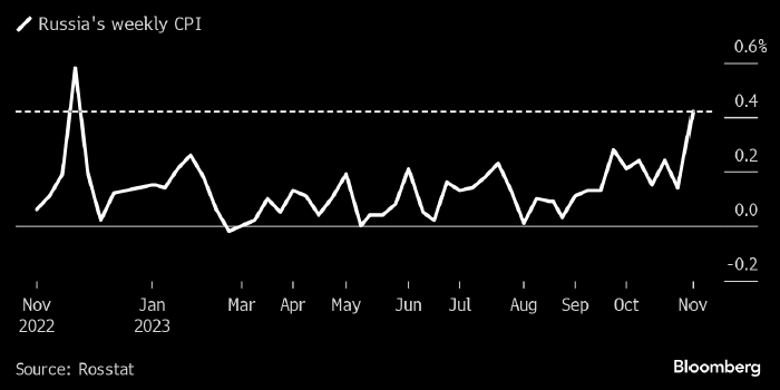 Ускорение инфляции было частично обусловлено ростом стоимости автомобилей, сообщил Росстат. В частности, Автоваз, на долю которого приходится четверть производимых в РФ автомобилей, повысил цены на модельный ряд «Лада». Динамика потребительской инфляции в России в базисе неделя к неделе. Данные: Росстат, источник: Bloomberg На неделе до 7 ноября потребительская инфляция в России ускорилась с 0,14% н/н до 0,42% н/н, что оказалось самым высоким показателем в текущем году. Об этом вечером пятницы сообщил Росстат. Стоит отметить, что эти данные покрыли восьмидневный период, а не семидневный, т. к. день 6 ноября был выходным. Темпы роста внутреннего спроса начали превышать возможности увеличения предложения, что стало главным фактором ускорения инфляции, отмечает экономист Финам Ольга Беленькая. Ускорение инфляции было частично обусловлено ростом стоимости автомобилей, сообщил Росстат. В частности, Автоваз, на долю которого приходится четверть производимых в РФ автомобилей, повысил цены на