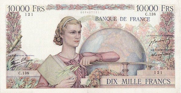 Последней (и самой крупной) в серии 1945 года стала купюра в 10 000 франков. Знак такого номинала во Франции выпустили впервые и билеты такого достоинства стали наибольшими, которые когда-либо печатались Банком Франции.