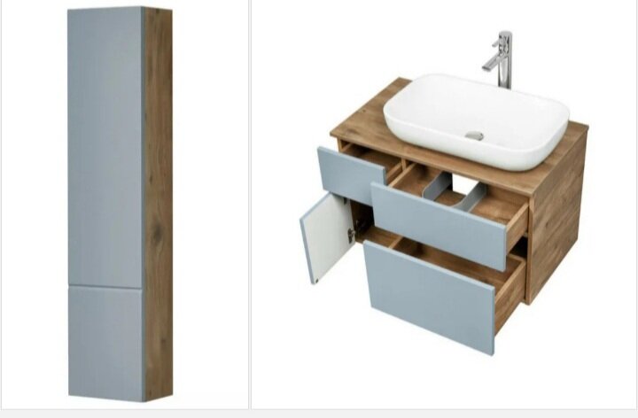Февраль 2022 до сдачи дома еще более полугода, а я сижу и просматриваю сайты строительных и мебельных магазинов, пытаясь продумать дизайн будущей квартиры. А чем еще заниматься человеку, который ждет получения ключей. В процессе таких просмотров я и наткнулась на мебель для ванны: тумба под раковину и небольшой навесной шкафчик серо-голубого цвета. Мебель, которую я встречала до этого в основном была белого цвета, а чаще всего в квартирах стояли раковины на подножках и висели пластиковые полки по периметру. В общем я решила, что хочу именно такую тумбу. Это пожалуй моя самая спонтанная и необдуманная покупка в новую квартиру. Что уж сказать подтолкнула меня к ней именно в тот момент, в том числе и начавшаяся в феврале СВО. Покупали же люди в кризис 14го года телевизоры, вот и я в 2022 купила мебель в ванну и потом почти целый год хранила её за дверью в комнате своей хрущевки. Тумба мне и сейчас безумно нравится, но и задачу она мне задала конечно. Ведь оказалось, что я не имею ни малей