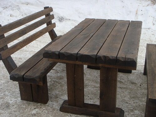 Стол со скамейками довольно часто устанавливают на веранды или под открытым небом. В отличие от описанных выше конструкций он не требует наличия дополнительных лавок или стульев, лавки входят в конструкцию стола.