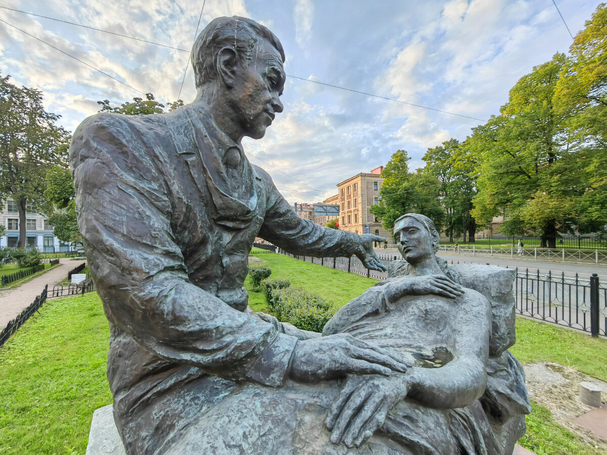 В одном из скверов Петербурга пару месяцев назад увидел трогательный памятник хирургу Фёдору Углову. Хочу вам его показать. Памятник был открыт 7 октября 2016 года. Бронзовый монумент представляет собой собирательный образ врача, заботливо склонившегося над пациентом, а на пьедестале нанесены слова Фёдора Углова: «Труд врача в высшей степени гуманен и благороден». Историческая справка Фёдор Григорьевич Углов (22 сентября [5 октября] 1904, Киренский уезд, Иркутское генерал-губернаторство — 22 июня 2008, Санкт-Петербург) — советский и российский хирург, писатель и общественный деятель, доктор медицинских наук, профессор. Главный редактор журнала «Вестник хирургии имени И. И. Грекова». Академик АМН СССР (1967; член-корреспондент 1955). Лауреат Ленинской премии (1982 год). Член Союза писателей России. Член КПСС с 1931 года. Создатель большой хирургической школы и автор изобретения «Искусственный клапан сердца и способ его изготовления». В годы Великой Отечественной войны Федор Углов всю