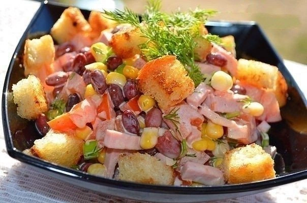 Ингредиенты: фасоль консервированная в с/соку 400 г, помидор 1 шт, кукуруза консервированная 1 маленькая банка, ветчина (или вареная колбаса) 150 г, зелень, хлеб белый 2 ломтика, чеснок 2 зубчика, майонез, соль и перец черный молотый. Приготовление: 1. С фасоли слить жидкость. Можно использовать отварную фасоль. Ветчину или колбасу порезать соломкой. 2. Помидор порезать кубиком. 3. Зелень измельчить. 4. Все смешать в миске, добавить рубленный чеснок. 5. С кукурузы слить жидкость, добавить к ингредиентам. 6. Посолить, поперчить, заправить майонезом, перемешать. 7. Хлеб порезать кубиками, подсушить на сковороде с маслом или без, по желанию. 8. Салат выложить в салатник, сверху сухарики. 9. Перед подачей перемешать. Вкусный, яркий салатик готов. ➕ СОХРАНИ рецепт, чтобы не потерять!! СПАСИБО ЗА ПОДПИСКУ И ОБРАТНУЮ СВЯЗЬ ПРИЯТНОГО АППЕТИТА❤️