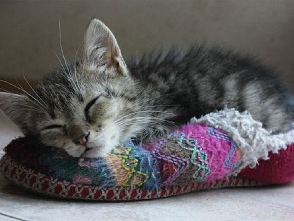 Утром, муж заметил котёнка на своём тапке, мирно спящего возле кровати.