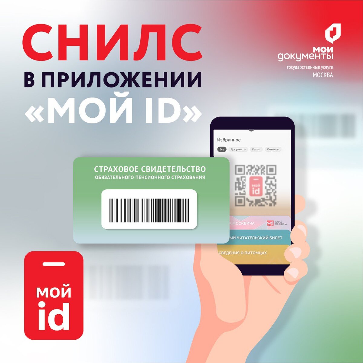«Мой ID в помощь» ❗❗❗ 📲Приложение «Мой id» можно использовать во всех центрах госуслуг для предъявления СНИЛС Теперь оформить госуслуги во всех столичных офисах «Мои Документы» можно быстрее с помощью штрихкода СНИЛС из мобильного приложения «Мой id». «Мой id» — это удобный инструмент для онлайн-доступа к данным документов: паспорту, СНИЛС, полису ОМС, карте москвича или единому читательскому билету. 📌Чтобы воспользоваться сервисом, достаточно авторизоваться в приложении с помощью своей учетной записи на портале mos.ru. ссылка на официальный телеграмм канал: