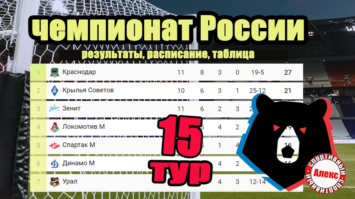 В чемпионате России по футболу завершился 15 тур. Лидеры потеряли очки, как после этого изменилась таблица? Начинаю наш великий обзор с результатов. . Крылья Советов наконец-то добыли победу, со счетом 3-1 повержен Урал. В компенсированное время (на 93-й) был удалён игрок гостей Газинский. А в первом тайме хозяева поля дважды пробивали пенальти. Если первый успешно реализовали, то второй отразил Илья Помазун. Его клуб к большому разочарованию терпит 5-ю поражение подряд. . Конкуренты Крыльев Советов Зенит и Краснодар разделил очки 1-1. Каждый уважающий себя поклонник российского футбола должен был смотреть эту игру. Что здесь ещё сказать? Кассьерра и Сперцян забили 19 голов на двоих. Матч установил рекорд посещаемости сезона - 46 тысяч зрителей. Краснодар не сумел победил Зенит в 11-й очной игре. Сейчас модно стало говорить про xG. То есть про ожидаемые голы. Так вот, Зенит - лучший клуб чемпионата по данному показателю. Вероятность – 2,47 за игру. На втором месте нынешний соперник Кр