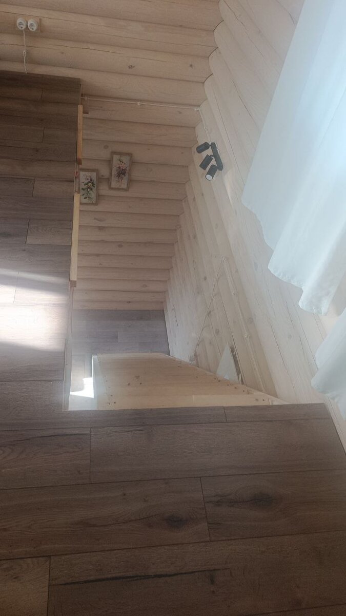 Небольшой дачный домик, на первом этаже баня, санузел, кухонька, на втором этаже комната отдыха. Под лестницу проем сделан размером 970*2900 при высоте от пола до пола 2750 мм. На первом этаже места только под поворотный узел лестницы. Так как остальное пространство первого этажа будет занято кухней. Заказчик сам рассчитал лестницу в бесплатной программе и попросил закруглить первую ступень, чтобы можно было заходить на лестницу с боку.. Лестница с пятью поворотными ступенями, с подступенками. На входе слева сделано небольшое ограждение. Как вы и заметили на картинке сверху, ширина марша 700 мм, при ширине проема в 970 мм. Это сделано специально, так как высота потолка не большая, чтобы на подъёме в повороте не зацепить макушкой головы край проема. Да и места под лестницу , как писалось ранее, было ограничено. Ступени, поручень из лиственницы, все остальное из сосны/ели. При таких размерах высота шага получилась 172 мм, проступь 220 мм, ступень 260 мм, где свес 40 мм. Расстояние между