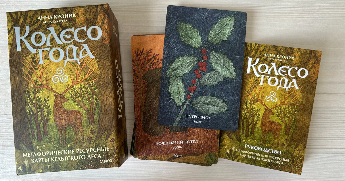 Сегодня хочу познакомить вас с колодой МАК «Колесо года. Метафорические ресурсные карты кельтского леса». В этой колоде волшебные кельтские легенды переплетаются с историями о природных циклах и лесной жизни. Карты будут сопровождать вас в путешествии по вашему Внутреннему Лесу. Автор колоды — Анна Кроник, практики Анны Духаревой Идея колоды состоит в том, что все её образы разделены на 5 блоков: 4 времени года и отдельное время — безвременье. В этом смысле метафора колоды хорошо подходит для работы с темой пути, проживания разных жизненных этапов, осознания, на каком этапе вы сейчас находитесь и что с вами происходит. Карты выполнены в приятных природных тонах. К каждой есть подпись, которая дает ей название и означает определённое время года. Например: Волшебный холм — Лето Вода — Безвременье Ворон — Осень На картах изображены лаконичные образы животных или магических элементов, например, волшебный котёл или ведьмин круг. Вы можете наполнять образы своими смыслами или прочитать задум