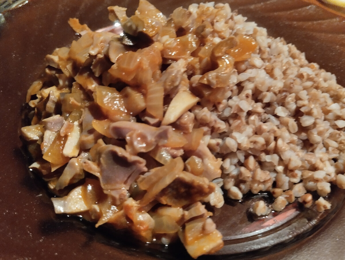 Привет, друзья! Не так давно я купила продуктов в Глобусе, рассказываю что я из них готовлю. Чек есть в статье, которая откроется по ссылке ниже. Вообще то упаковку куриных желудков я купила для Бабая всего за 142 рубля, но они были такими свежими и аппетитными, что я решила на ужин потушить их с грибами. Одну треть пачки отварила, причем первые 2 воды сливала. Отваренные желудки мелко порезала. Часть отдала Бабаю он оценил по достоинству. Отдельно пожарила несколько грибов, у меня были куплены королевские шампиньоны, с луком. Добавила грибы к желудкам, посолила и потушила, добавив немного томатной пасты. Отдельно сварила гречки на гарнир. На двоих надо не более 4-5 ложек крупы. Крупу промыла, залила водой, довела до кипения, промыла и уже варила в бульоне из под желудков до готовности. И вот результат. Посчитаем себестоимость 1й порции? Желудки-50 рублей Грибы-30 рублей Лук, масло -5 рублей Греча-8 рублей. Томатная паста была давно куплена, ну пусть ещё 2 рубля. Получаетс
