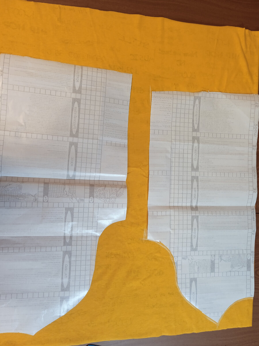 На тему одежды для дома разная философия встречается. Кто-то считает, что главное удобство, а остальное не важно. Некоторые наоборот пренебрегают этой характеристикой, чтобы оставаться элегантными, подчёркивая достоинства своей фигуры. И тех, и других, а ещё, кого-нибудь третьего я поддерживаю. Кому, что по душе. У меня отдельная история, потому что много лет я работаю дома. Останавливаю свой выбор на том, чтобы вещи радовали и вдохновляли, помимо удобства. Я же творческая личность, мне по-другому нельзя. За основу беру топ с рукавами реглан из Бурды. Как всегда сверяю свои мерки в таблице размеров и делаю выкройку. Бумажные лекала футболки раскладываю на трикотажной ткани. Переднюю часть выкраиваю короче задней на 6-7 см, когда вставлю чёрные полоски на грудь, они выровняют низ. Дальше всё по 4 см. Расстояние от проймы до отметки, где будет верхняя первая вставка, ширина чёрной полосы и между бейками тоже 4 см, вместе с припусками. Почему-то я решила, что чёрные полосы будут тут, кста