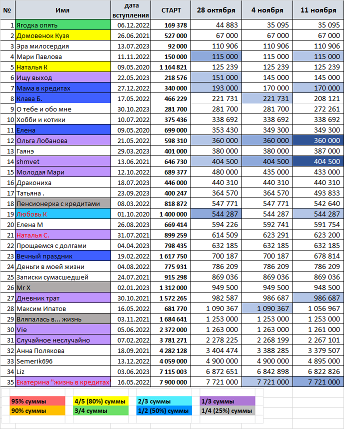 Привет всем! Готовы результаты очередной недели. По правде говоря, они-то давно готовы, но не была готова я! Иной раз так трудно заставить себя сесть за компьютер, сосредоточиться, а тут ещё куча дел и дети сосредоточиться не дают... В общем, обычное "потом сделаю" - и вот, здравствуй новый день (и новая рабочая неделя), ну теперь точно есть время на марафон. На этой неделе есть один переход в новую цветовую категорию. У кого - пока не скажу! Пусть интрига будет. А я буду рассказывать обо всём по порядку. А начнем, как обычно, с наших пьедесталов. Кто же погасил самые большие суммы за эту неделю? Первое место - Максим Ипатов с суммой 33400. Второе - Вечный праздник, погасившая 21373р. А на третьем - Liz с результатом минус 20072р. Поздравляем! Суммы суммами, но также мы учитываем погашение в процентах от долга за неделю. И здесь призовые места распределились так: На первом месте - Клава Б., погасившая 6,14% от своего долга. На втором месте - О тебе и обо мне (новичок!) с результатом ми