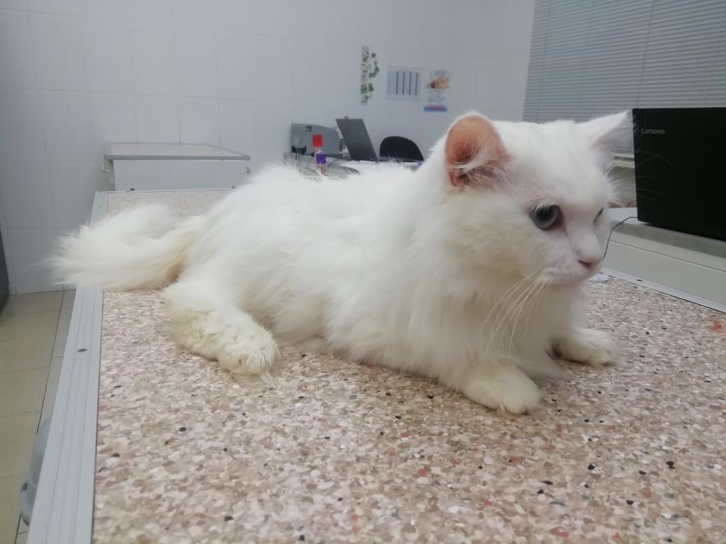 Кота в ужасном состоянии в приют принесла девушка в прошлом году. С ее слов, кота им подбросили, они за ним следили, пытались лечить, но сил у них уже нет, заберите в приют. У кота нет задней лапы, поврежден позвоночник, потому что туалетные дела все под себя делает, задняя часть кота месиво из грязной шерсти, мочи и кала. Думаем, что кот был домашний, покалечился на самовыгуле, ухаживать за котом хозяевам надоело, поэтому и отдали в приют. Кота назвали Беломор, он хороший добрый кот. Здоровье ему уже не вернуть, но поддерживать его всеми доступными способами мы стараемся. А проблем со здоровьем у спинальников много, чаще всего с мочеполовой системой. Но каждый случай обострения болезни очень опасен, поэтому когда в воскресенье у Беломора пошла моча с кровью, его экстренно отвезли на стационар в Ветцентр. Сейчас анализы у кота хорошие, но моча ещё была с кровью. Под наблюдением врачей Беломор пробыл ещё некоторое время. Теперь он особенный кот в плане физических недостатков, но соверше