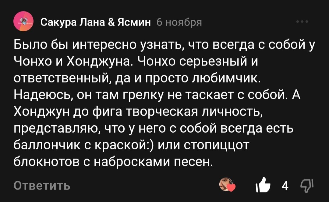 Неделю назад мы с вами «покопались» в сумках Уёна и Сана и узнали, что же предпочитают брать с собой парни во время поездок. Кстати, тогда случилось кое-что – на следующий день после выхода статьи Тизы отправились в Лондон, и Уён забыл свой чемодан в общежитии. При нем были только iPad, кошелек, наушники и повербанк🤭 Это, конечно, нужные вещи, но одежда тоже необходима😂 Вернемся к нашей теме😁 Под прошлой статьей я увидела комментарий с пожеланием узнать, что же с собой берут Хонджун и Чонхо. И поэтому сегодня мы заглянем в их сумки😉 Не забудьте поставить лайка и подписаться на канал, чтобы не пропустить выход интересного контента о Корее и ваших любимых айдолах💗 Хонджун Сначала узнаем, что лежит в сумке капитана ATEEZ. 💻 Ноутбук Трудяжка Хонджун не может не работать, поэтому с ним всегда его ноутбук – музыкальная сокровищница✨ 🤠 Берет Наш капитан, наверное, в душе немного француз🤭, поэтому предпочитает брать с собой берет. К слову, этот головной убор ему очень подходит! 💳 Ск